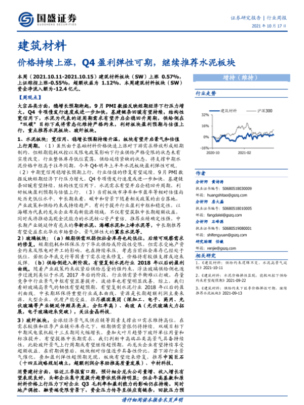 【国盛证券】【20211017】建筑材料行业周报:价格持续上涨,Q4盈利弹性可期,继续推荐水泥板块-12页
