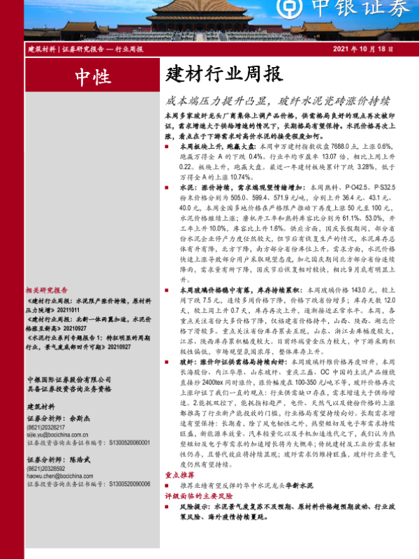 【中银证券】【20211018】建材行业周报:成本端压力提升凸显,玻纤水泥瓷砖涨价持续-19页