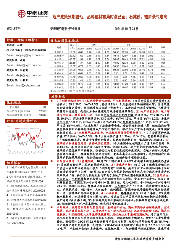 【中泰证券】【20211024】建筑材料行业周报:地产政策预期波动,品牌建材布局时点已至;石英砂、玻纤景气度高-25页