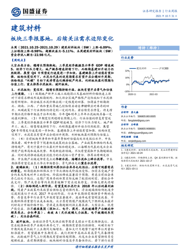 【国盛证券】【20211031】建筑材料行业周报:板块三季报落地,后续关注需求边际变化-12页