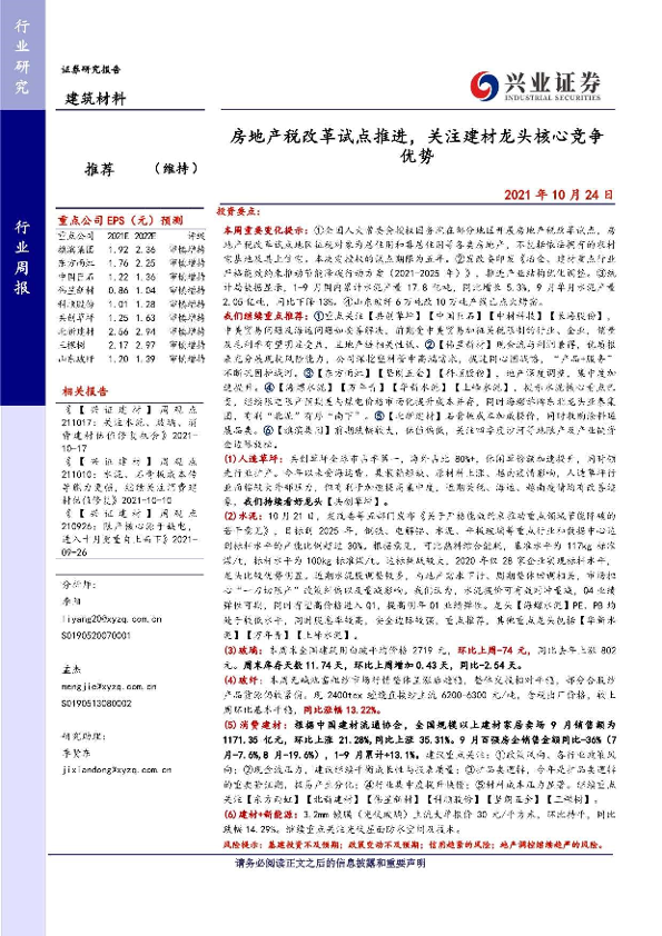 【兴业证券】【20211024】建筑材料:房地产税改革试点推进,关注建材龙头核心竞争优势-23页