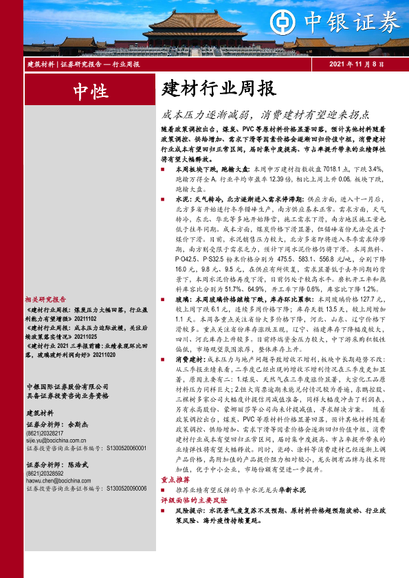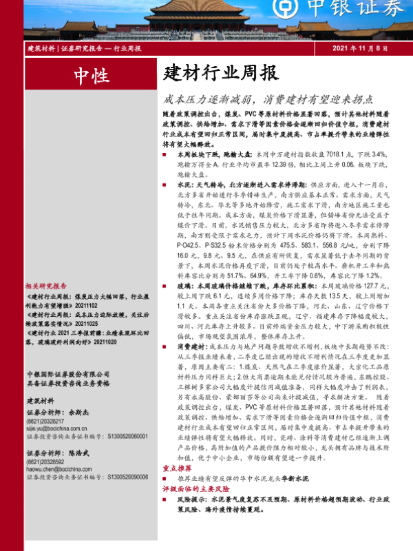 【中银证券】【20211108】建材行业周报:成本压力逐渐减弱,消费建材有望迎来拐点-20页
