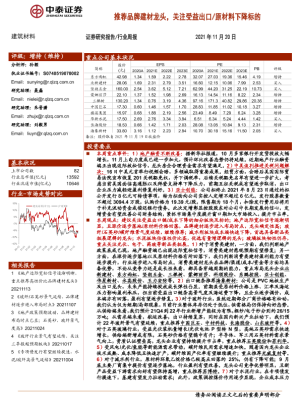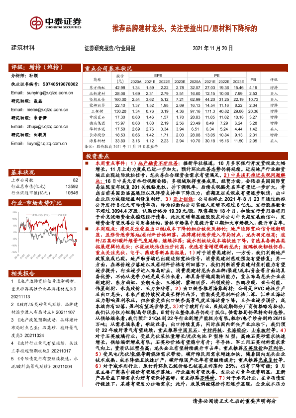 【中泰证券】【20211120】建筑材料行业周报:推荐品牌建材龙头,关注受益出口原材料下降标的-25页
