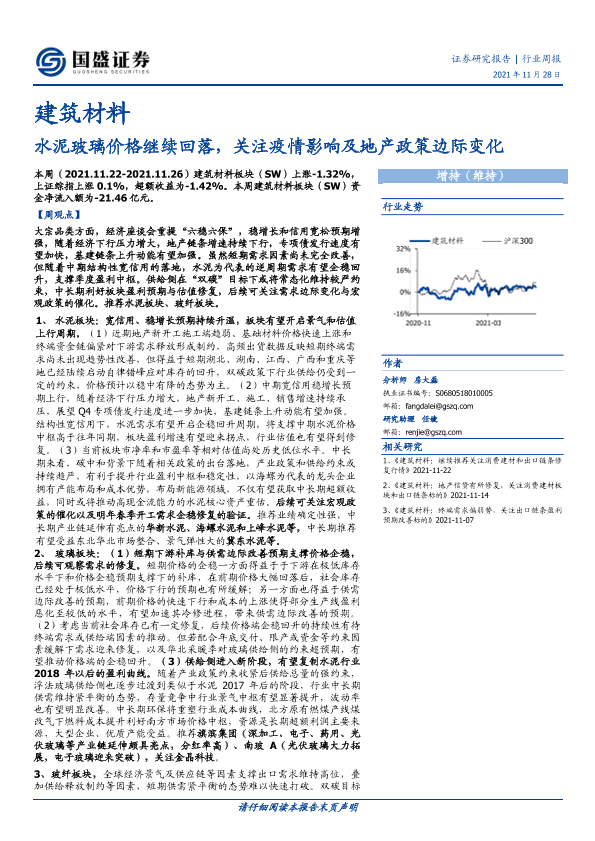 【国盛证券】【20211128】建筑材料行业周报:水泥玻璃价格继续回落,关注疫情影响及地产政策边际变化-12页