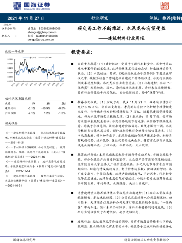 建筑材料 水泥 碳交易 行业周报 证券分析