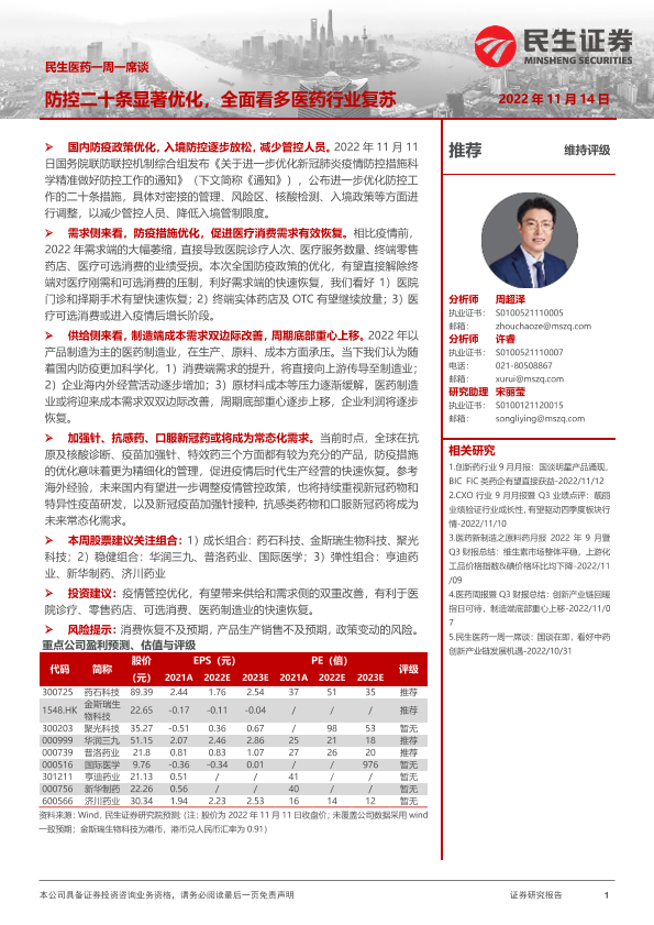 【民生证券】【20221114】民生医药一周一席谈:防控二十条显著优化,全面看多医药行业复苏-17页