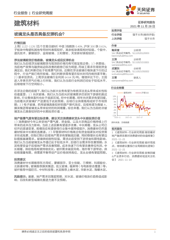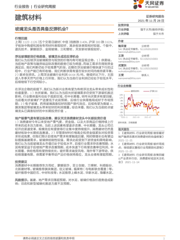 【天风证券】【20211128】建筑材料行业研究周报:玻璃龙头是否具备反弹机会?-7页
