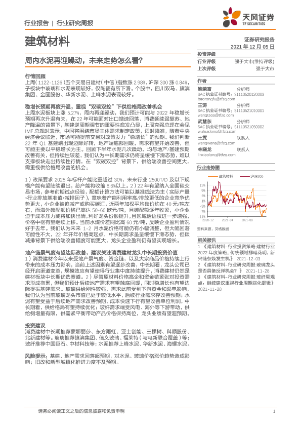 【天风证券】【20211205】建筑材料行业研究周报:周内水泥再迎躁动,未来走势怎么看?-9页
