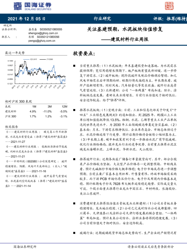 【国海证券】【20211205】建筑材料行业周报:关注基建预期,水泥板块估值修复-20页