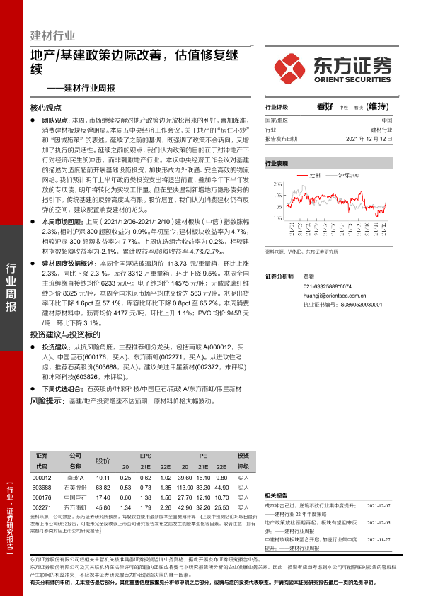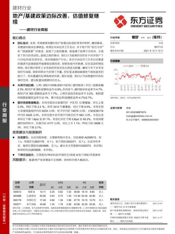 【东方证券】【20211212】建材行业周报:地产/基建政策边际改善,估值修复继续-22页