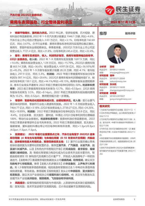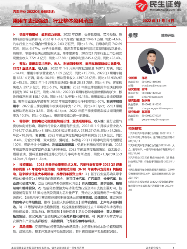 【民生证券】【20221114】汽车行业2022Q3业绩综述:乘用车表现强劲,行业整体盈利承压-29页