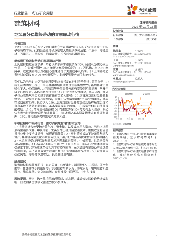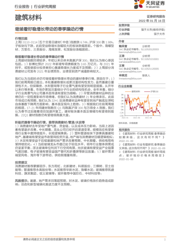 【天风证券】【20220116】建筑材料行业研究周报:继续看好稳增长带动的春季躁动行情-5页