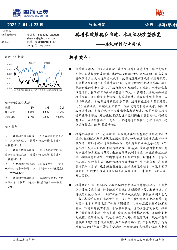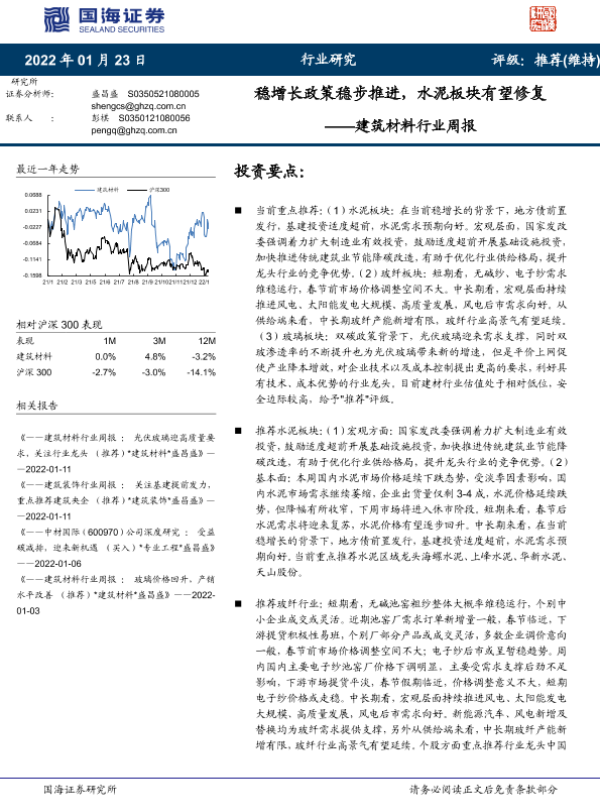 【国海证券】【20220123】建筑材料行业周报:稳增长政策稳步推进,水泥板块有望修复-19页