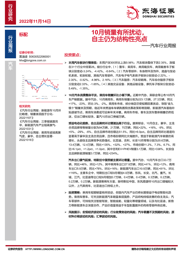 【东海证券】【20221114】汽车行业周报:10月销量有所扰动,自主仍为结构性亮点-15页