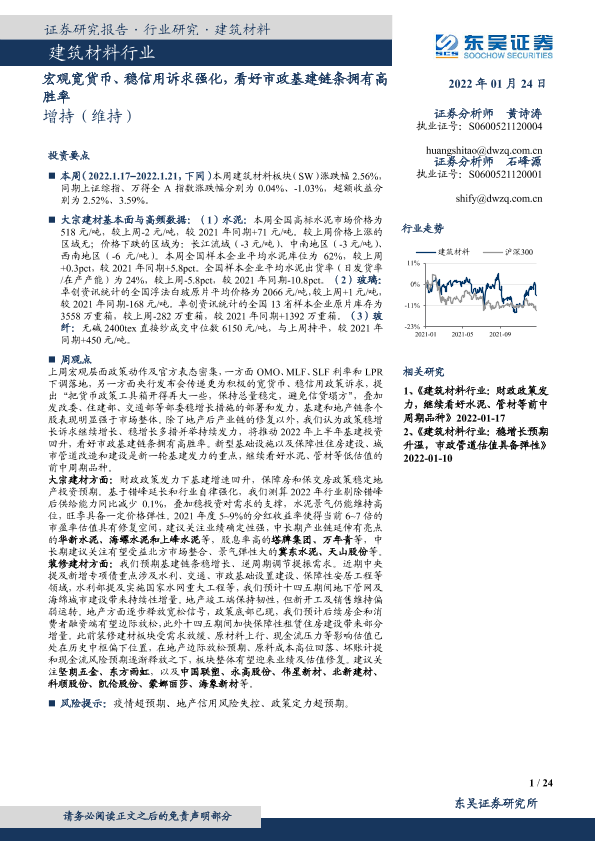 【东吴证券】【20220124】建筑材料行业:宏观宽货币、稳信用诉求强化,看好市政基建链条拥有高胜率-24页