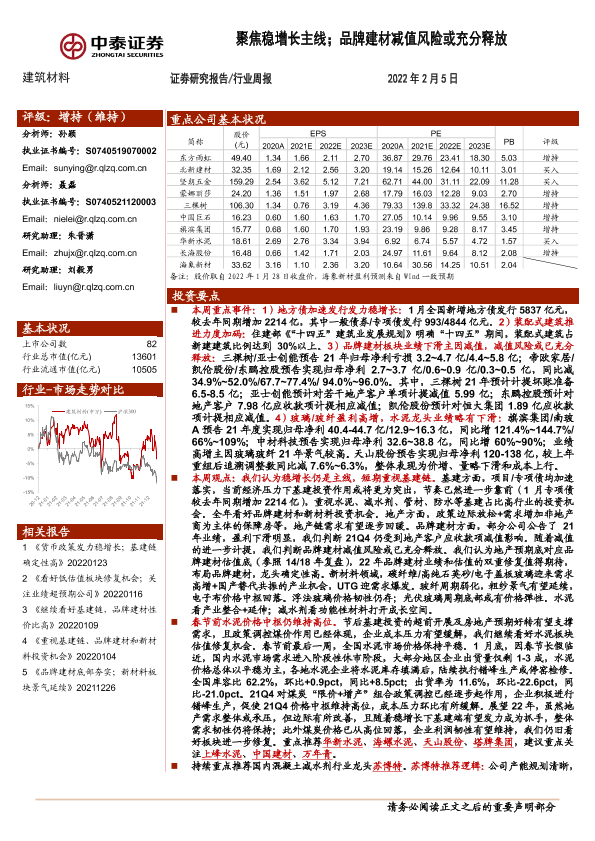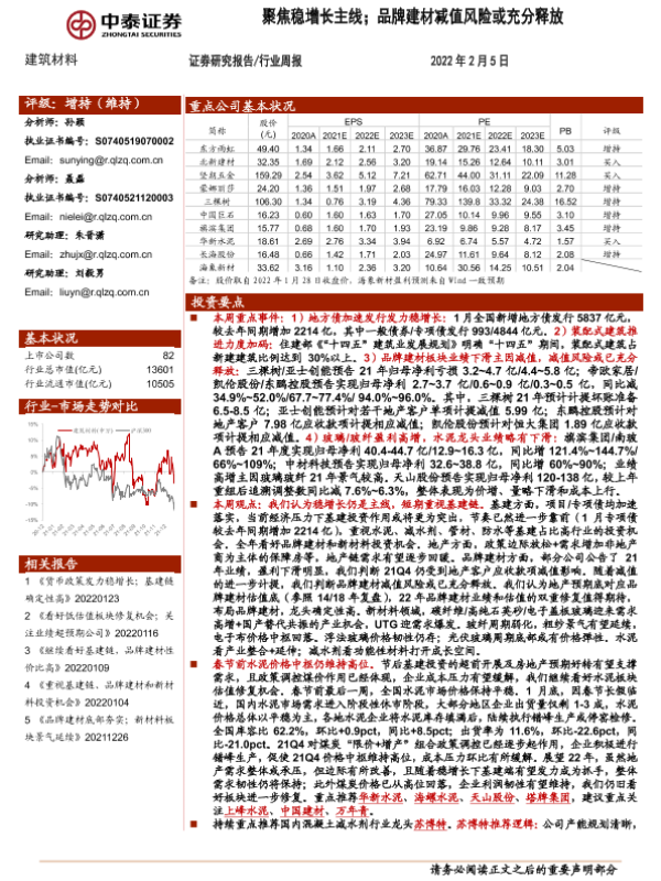 【中泰证券】【20220205】建筑材料行业周报:聚焦稳增长主线;品牌建材减值风险或充分释放-25页