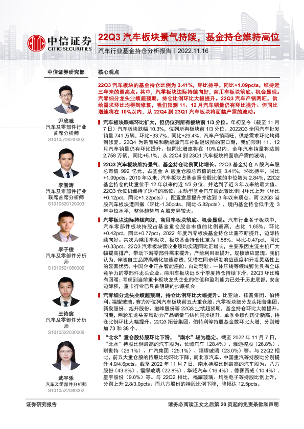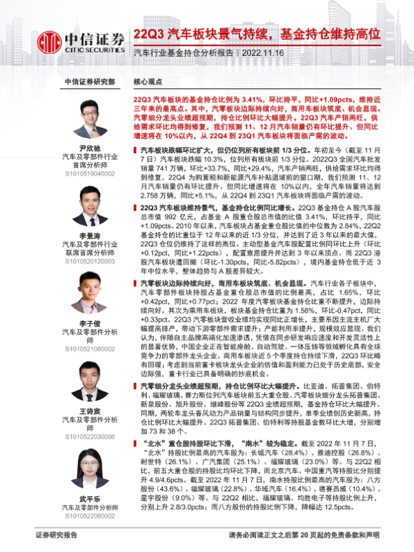 【中信证券】【20221116】汽车行业基金持仓分析报告:22Q3汽车板块景气持续,基金持仓维持高位-21页