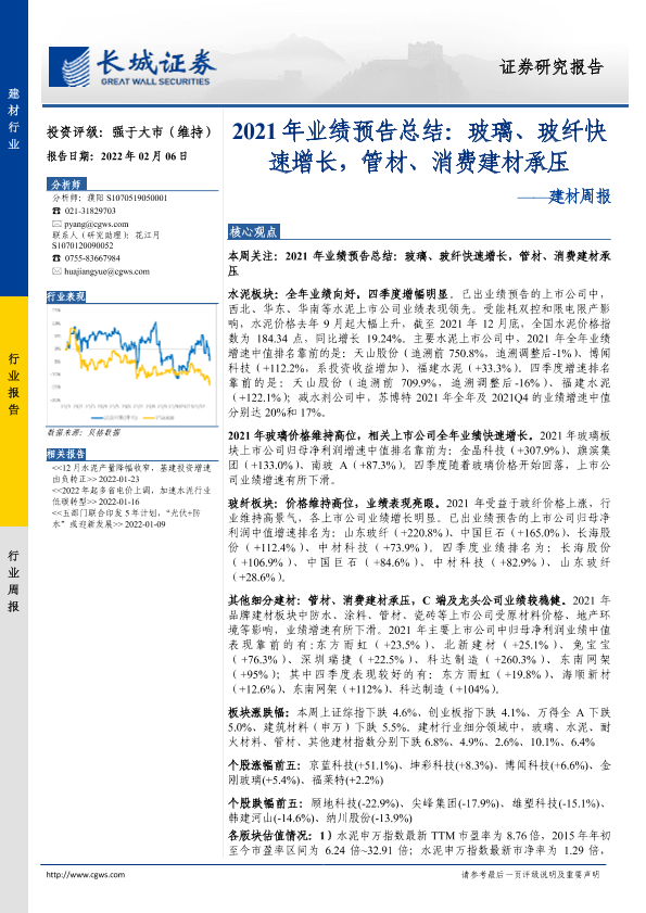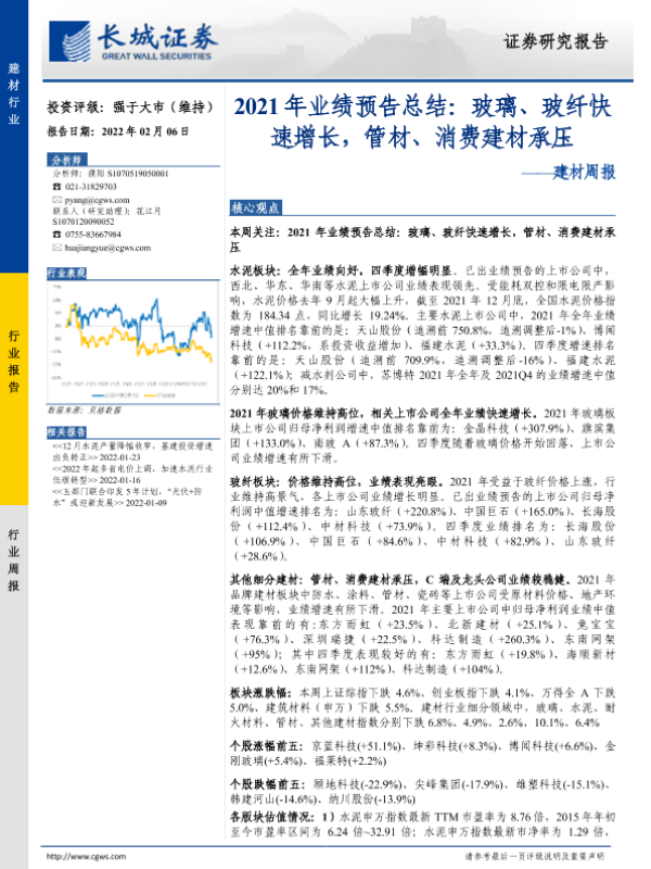 【长城证券】【20220206】2021年业绩预告总结:玻璃、玻纤快速增长,管材、消费建材承压-20页