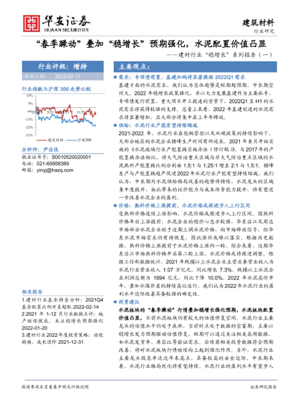 【华安证券】【20220217】建材行业'稳增长'系列报告(一):'春季躁动'叠加'稳增长'预期强化,水泥配置价值凸显-14页