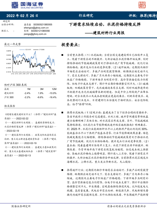 【国海证券】【20220226】建筑材料行业周报:下游需求陆续启动,水泥价格持续反弹-20页