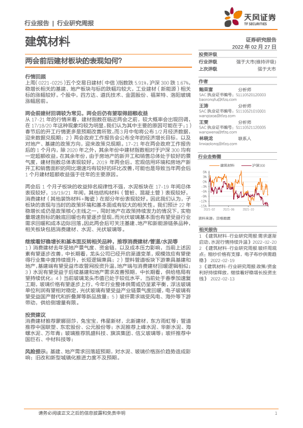 【天风证券】【20220227】建筑材料行业研究周报:两会前后建材板块的表现如何?-7页