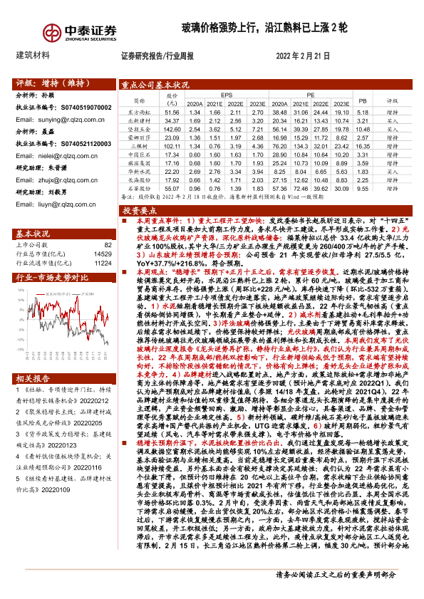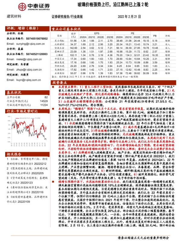 【中泰证券】【20220221】建筑材料行业周报:玻璃价格强势上行,沿江熟料已上涨2轮-26页