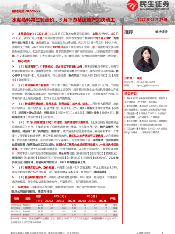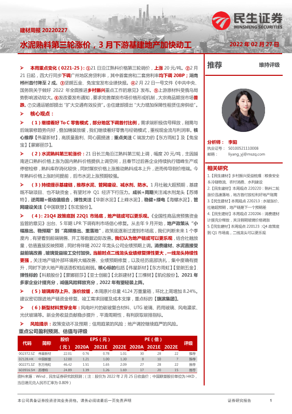 【民生证券】【20220227】建材周报:水泥熟料第三轮涨价,3月下游基建地产加快动工-19页