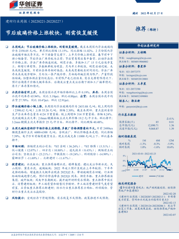 【华创证券】【20220227】建材行业周报:节后玻璃价格上涨较快,刚需恢复缓慢-18页