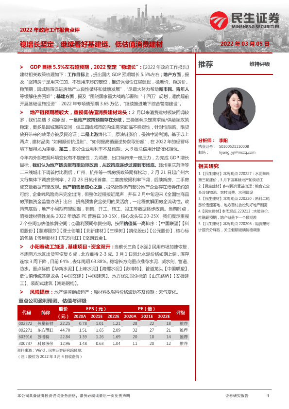 【民生证券】【20220305】2022年政府工作报告点评:稳增长坚定,继续看好基建链、低估值消费建材-2页