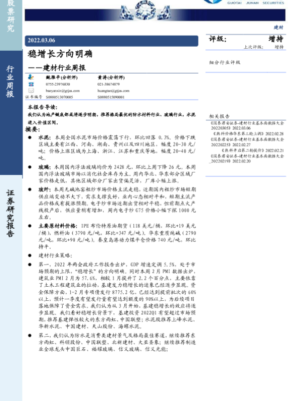 【国泰君安证券】【20220306】稳增长方向明确——建材行业周报-25页