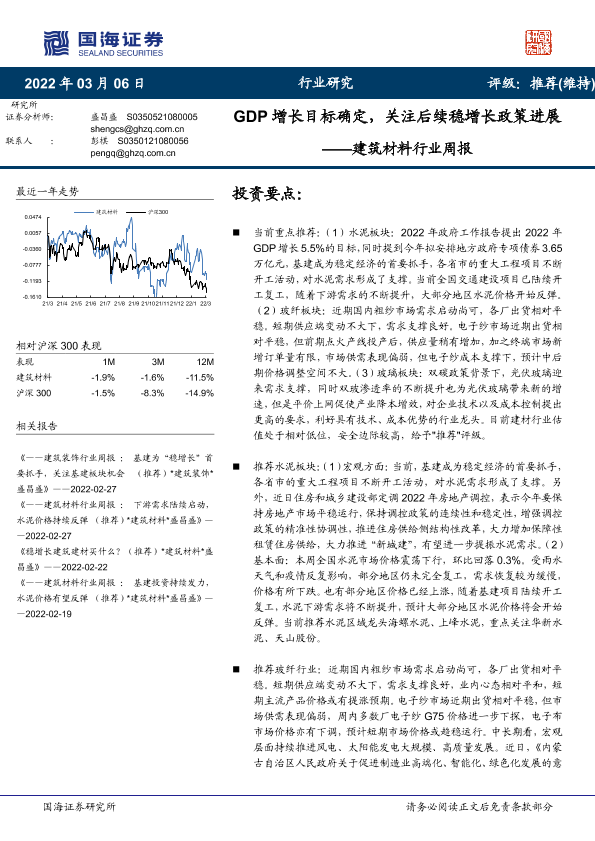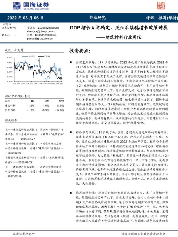 GDP增长 建筑材料 水泥价格 稳增长政策 行业周报
