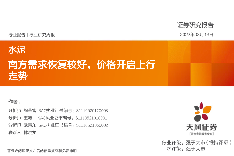 【天风证券】【20220313】水泥行业研究周报:南方需求恢复较好,价格开启上行走势-23页
