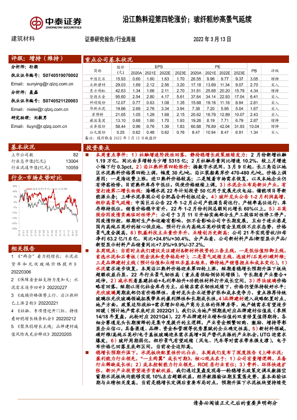 【中泰证券】【20220313】沿江熟料迎第四轮涨价;玻纤粗纱高景气延续-27页