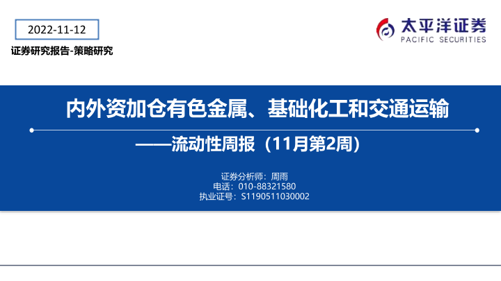 【太平洋证券】【20221112】流动性周报(11月第2周):内外资加仓有色金属、基础化工和交通运输-19页