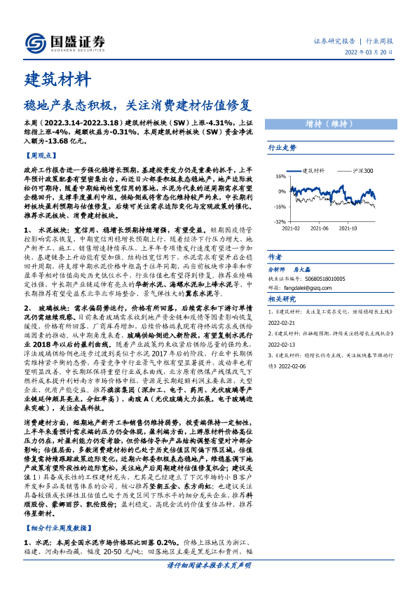 【国盛证券】【20220320】稳地产表态积极,关注消费建材估值修复-11页