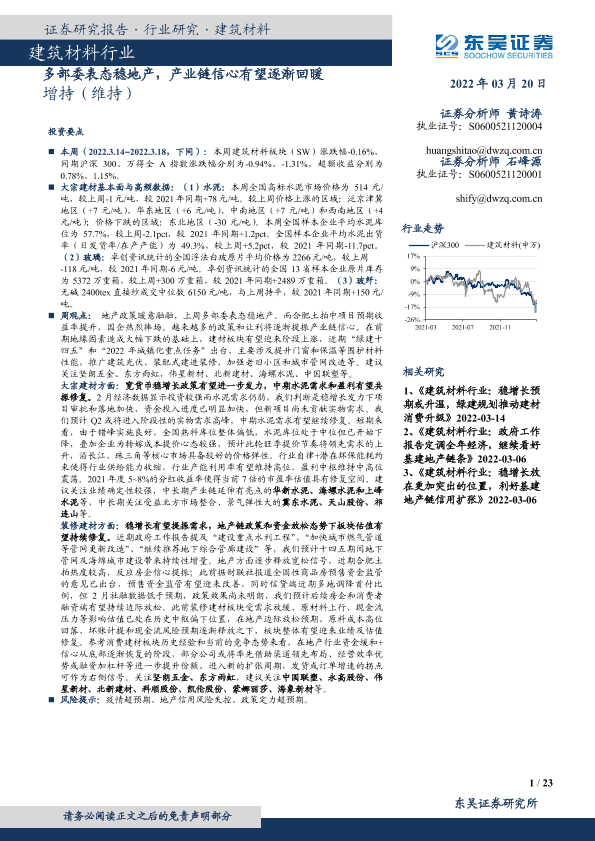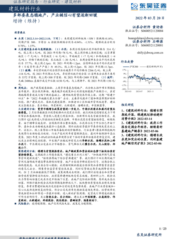 【东吴证券】【20220320】建筑材料行业:多部委表态稳地产,产业链信心有望逐渐回暖-23页