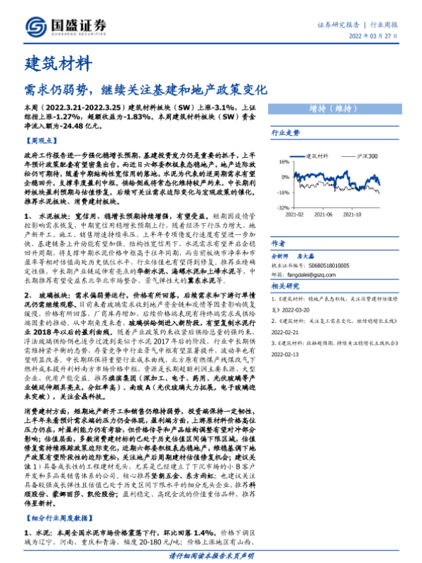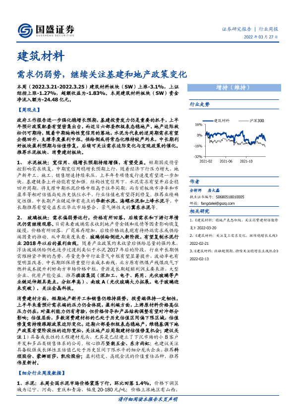 【国盛证券】【20220327】建筑材料行业周报:需求仍弱势,继续关注基建和地产政策变化-11页