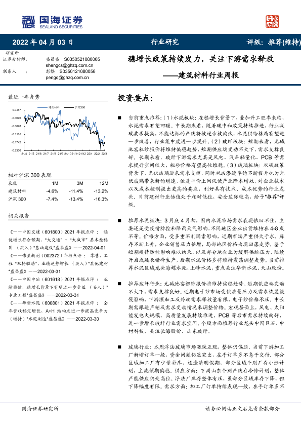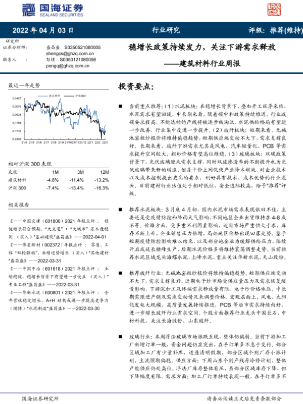 【国海证券】【20220403】建筑材料行业周报:稳增长政策持续发力,关注下游需求释放-20页