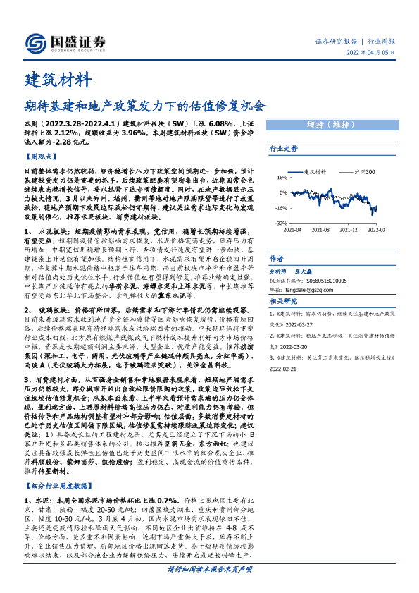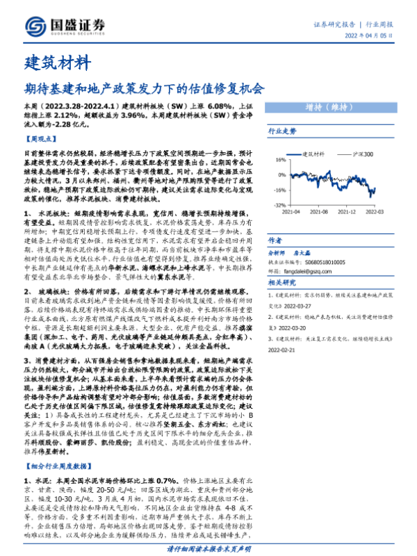 【国盛证券】【20220405】建筑材料行业周报:期待基建和地产政策发力下的估值修复机会-11页