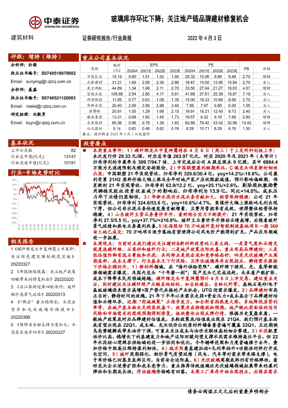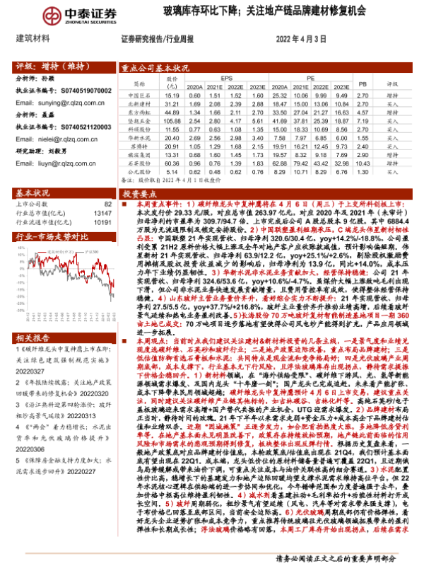 【中泰证券】【20220403】建筑材料行业周报:玻璃库存环比下降;关注地产链品牌建材修复机会-26页
