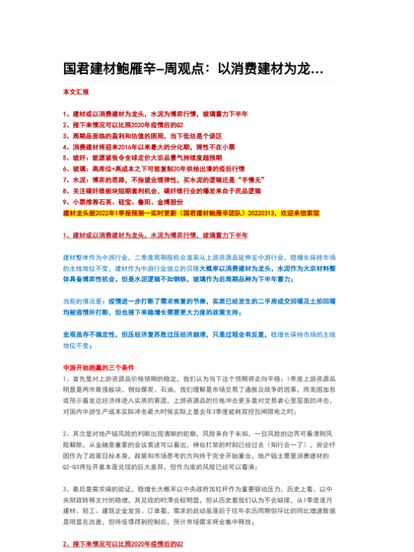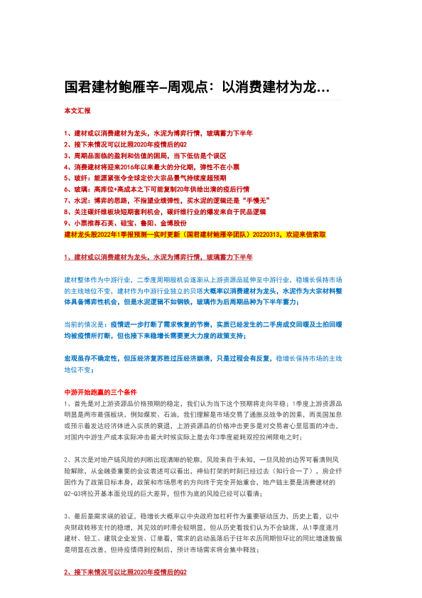 【国泰君安证券】【20220410】建材行业周观点:以消费建材为龙头,水泥博弈,玻璃蓄力下半年-15页