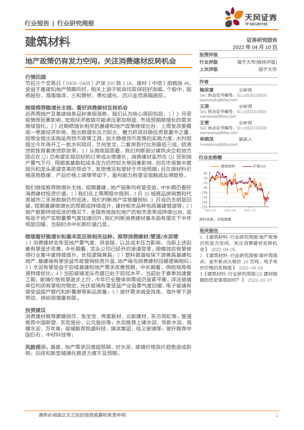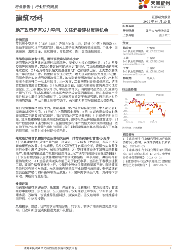 【天风证券】【20220410】建筑材料行业研究周报:地产政策仍有发力空间,关注消费建材反转机会-5页