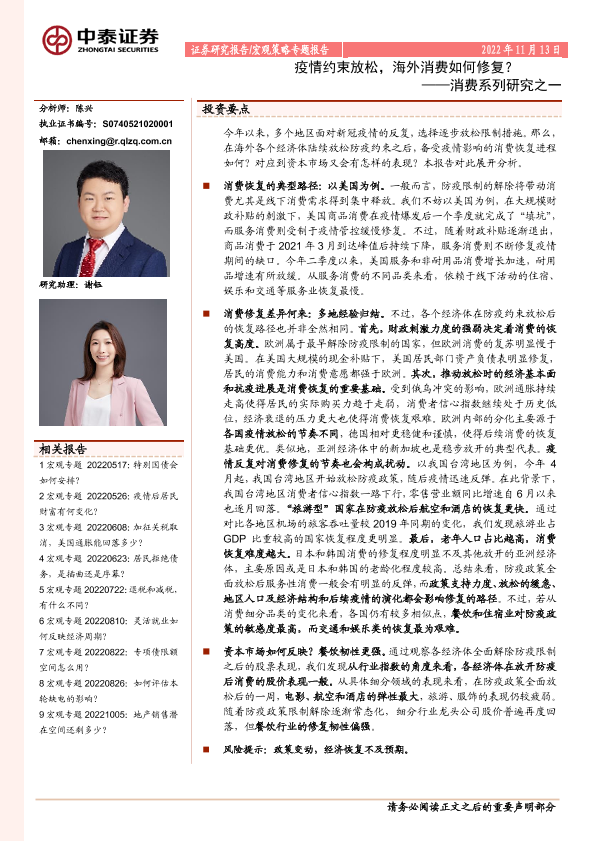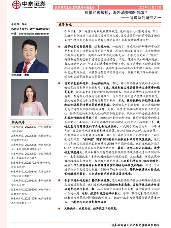 【中泰证券】【20221113】消费系列研究之一:疫情约束放松,海外消费如何修复?-16页