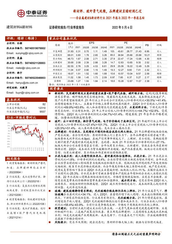 【中泰证券】【20220506】非金属建材&新材料行业2021年报与2022年一季报总结-45页