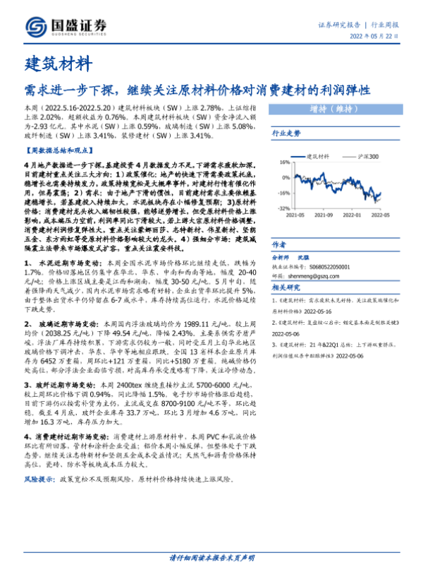 【国盛证券】【20220522】建筑材料:需求进一步下探,继续关注原材料价格对消费建材的利润弹性-11页