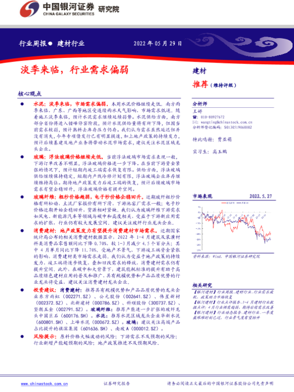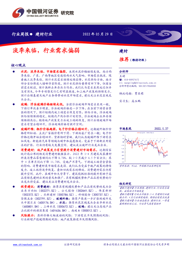 【银河证券】【20220529】建材行业周报:淡季来临,行业需求偏弱-12页