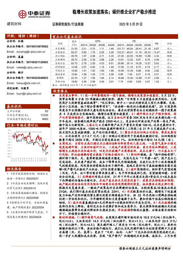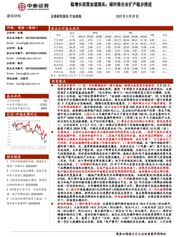 【中泰证券】【20220529】建筑材料行业周报:稳增长政策加速落实;碳纤维企业扩产稳步推进-26页