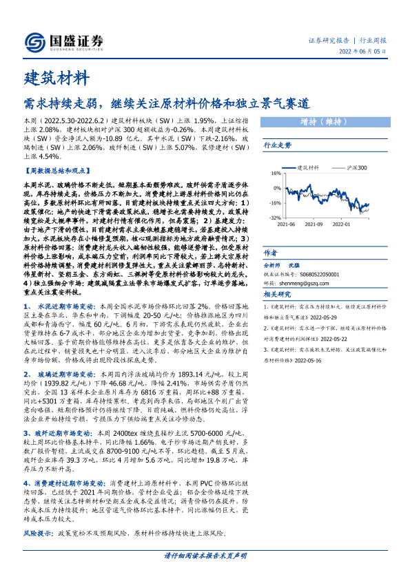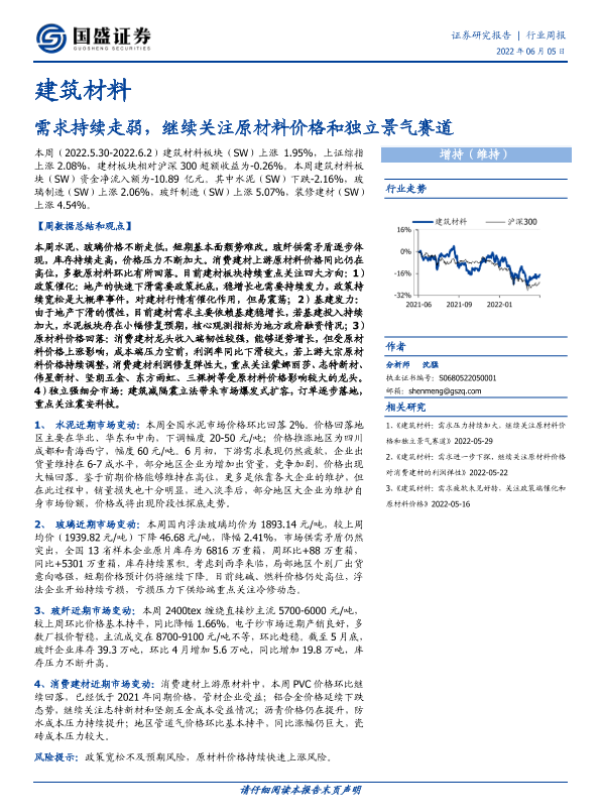 【国盛证券】【20220605】建筑材料行业周报:需求持续走弱,继续关注原材料价格和独立景气赛道-12页