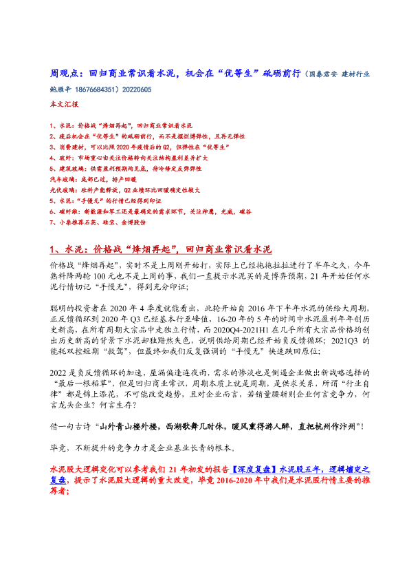 【国泰君安证券】【20220605】建材行业周观点:回归商业常识看水泥,机会在“优等生”砥砺前行-17页