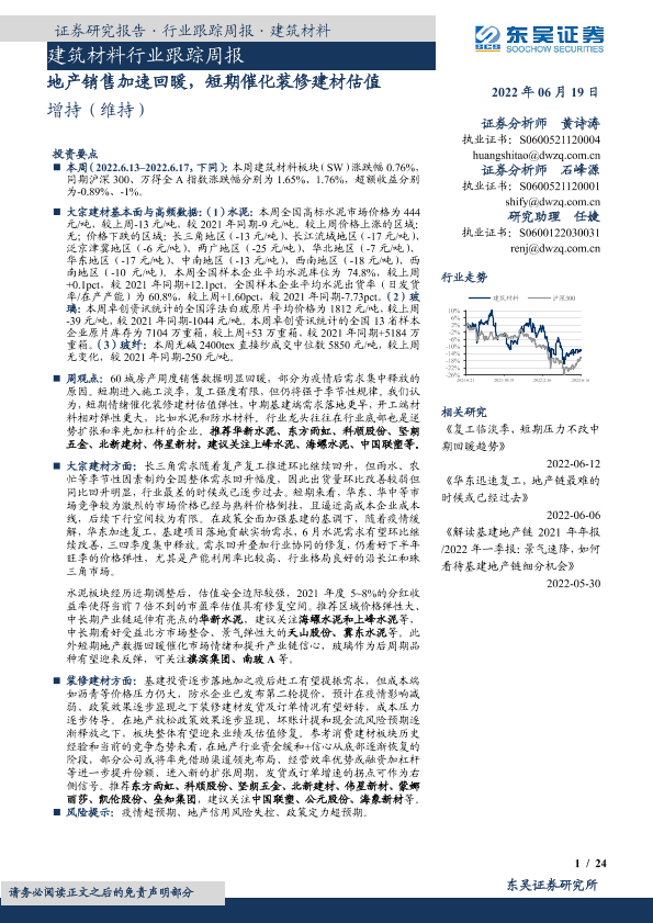 【东吴证券】【20220619】建筑材料行业跟踪周报:地产销售加速回暖,短期催化装修建材估值-24页